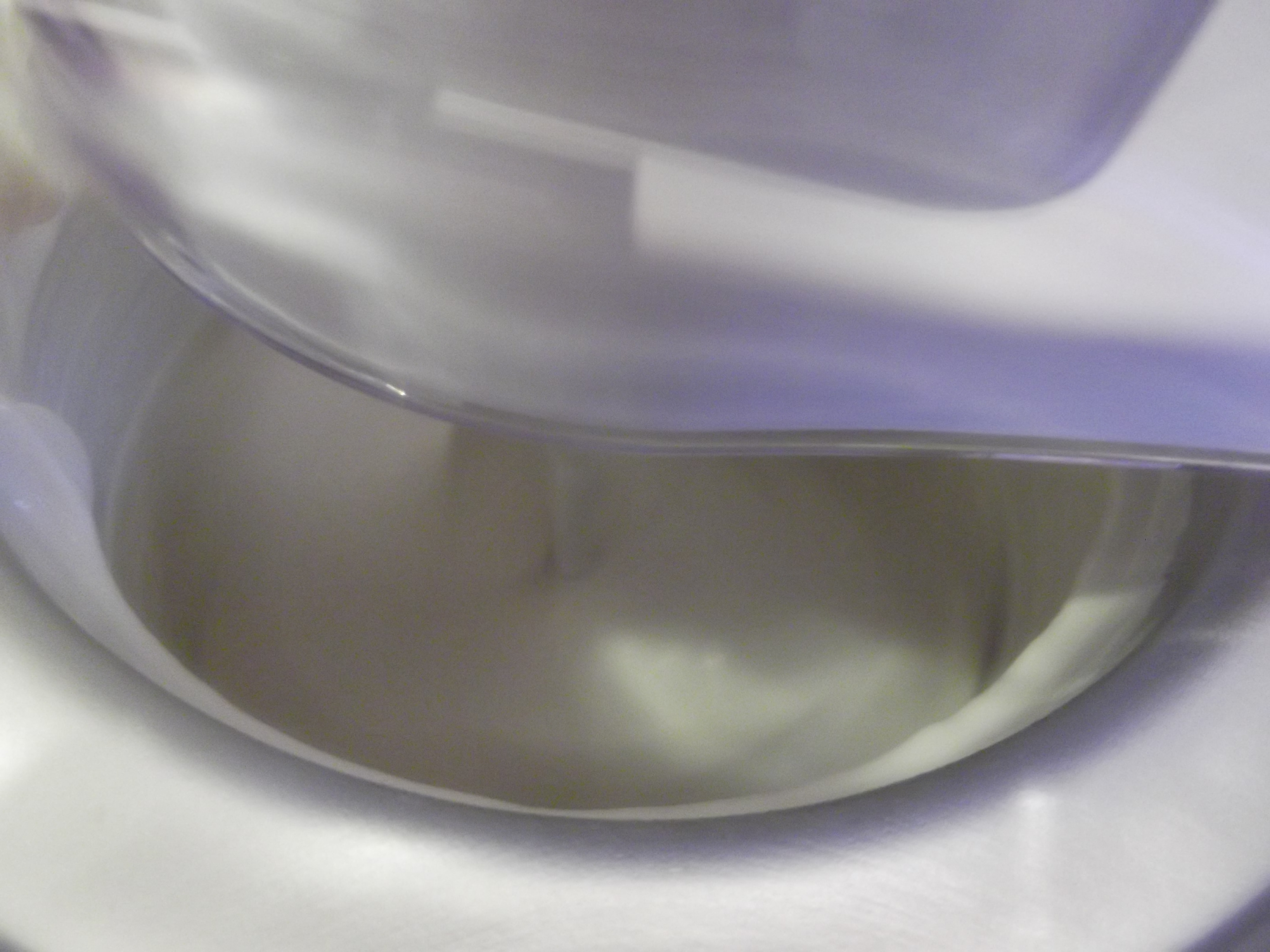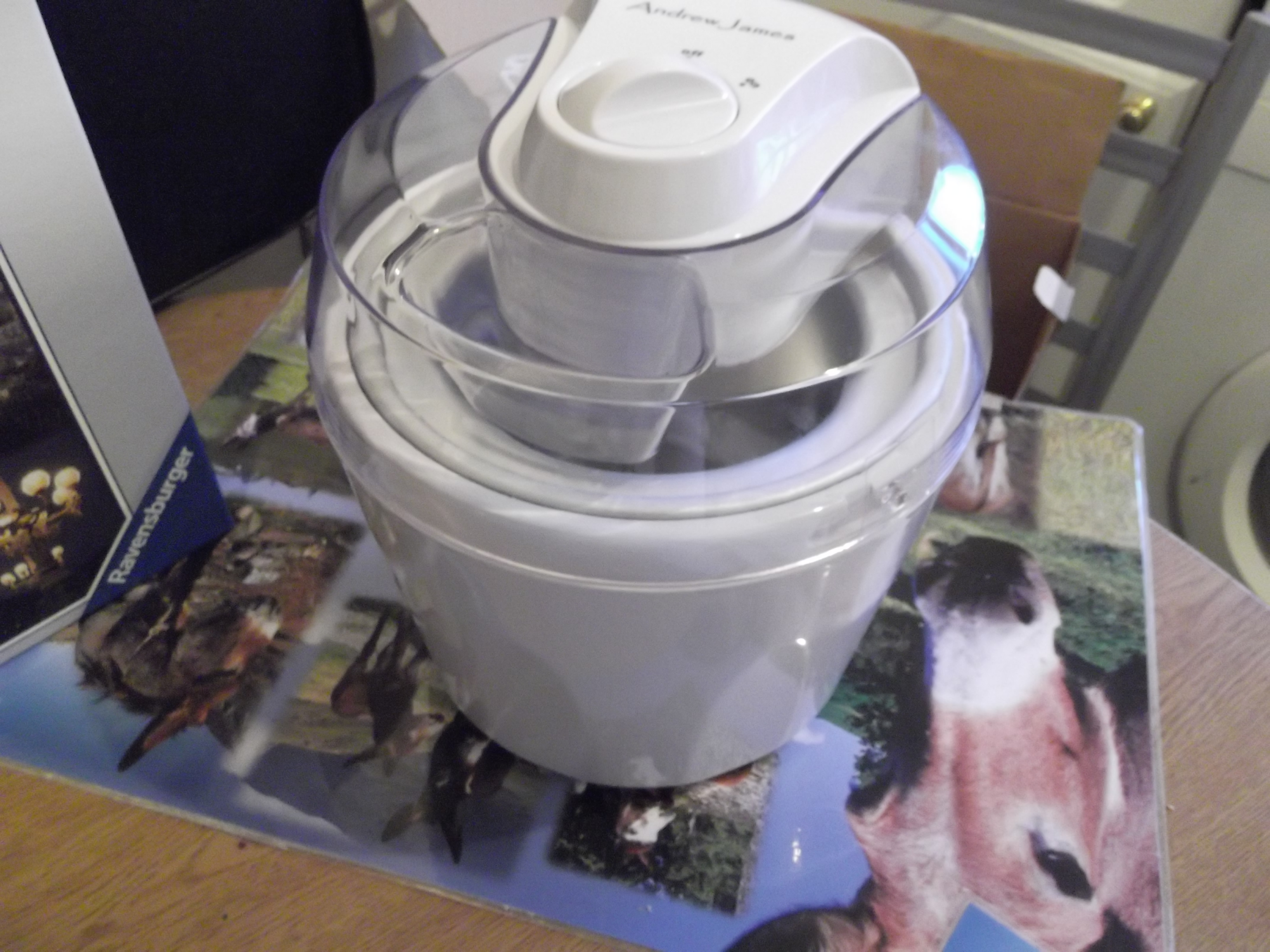 Then I plugged the machine in, got the inner bowl out and put in the outer bowl, closed the lid and turned it on. Unfortunately, you have to put the mixture in after the lid is on, so it doesn’t freeze on touching the bowl. So you’re left having to feed it through a fairly small hole. This gets stuff everywhere, although I think I managed quite well.