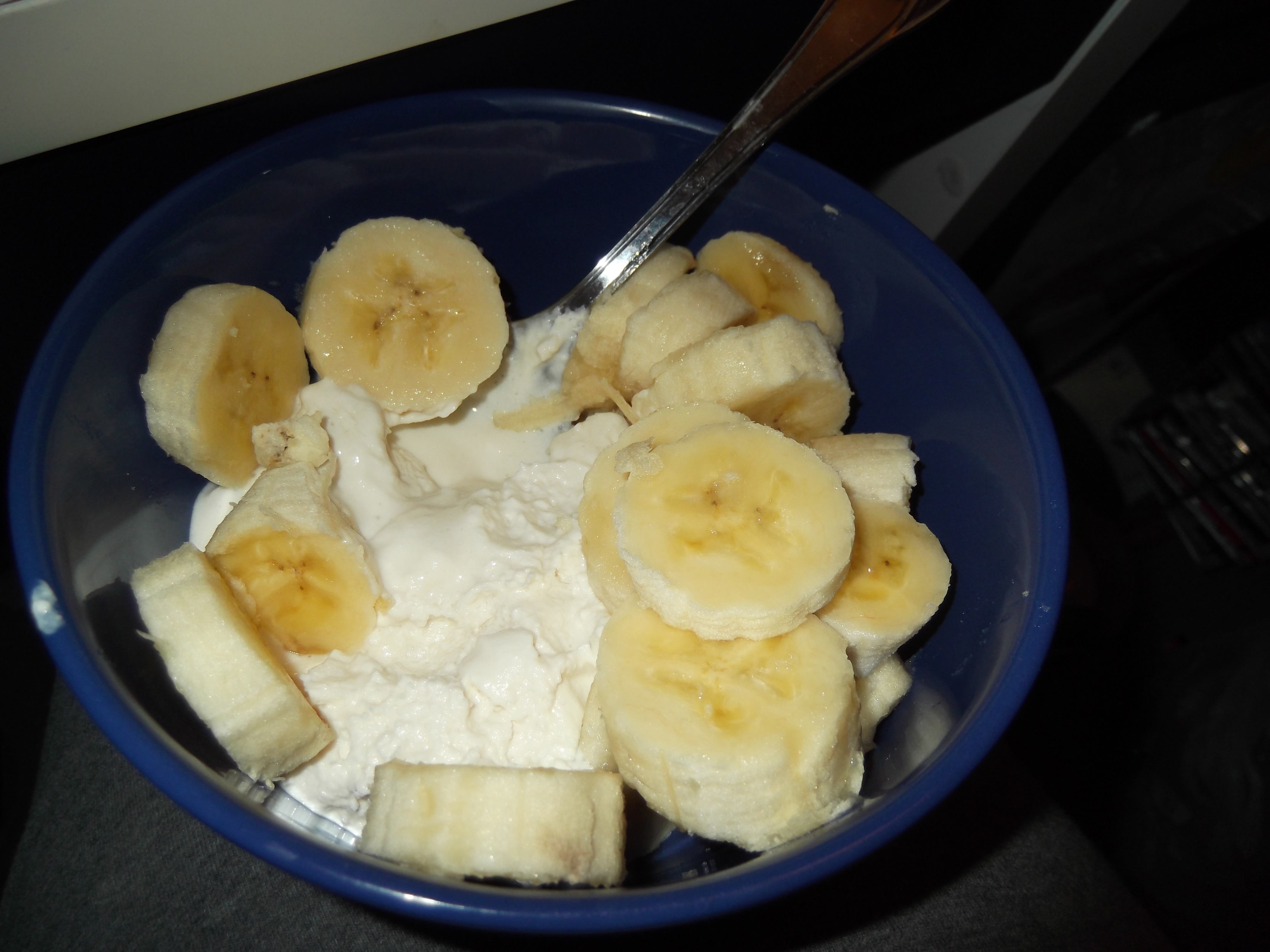 When I removed the mixture a few hours later, it looked less like frozen yoghurt and more like icicles, but I guess it was just in too long. If you stir it a little bit it looks better. I served it with a banana, like at SNOG, and I thought it tasted fine, but one of my flatmates thought it lacked sugar. I guess she has quite a sweet tooth as we were two to one.