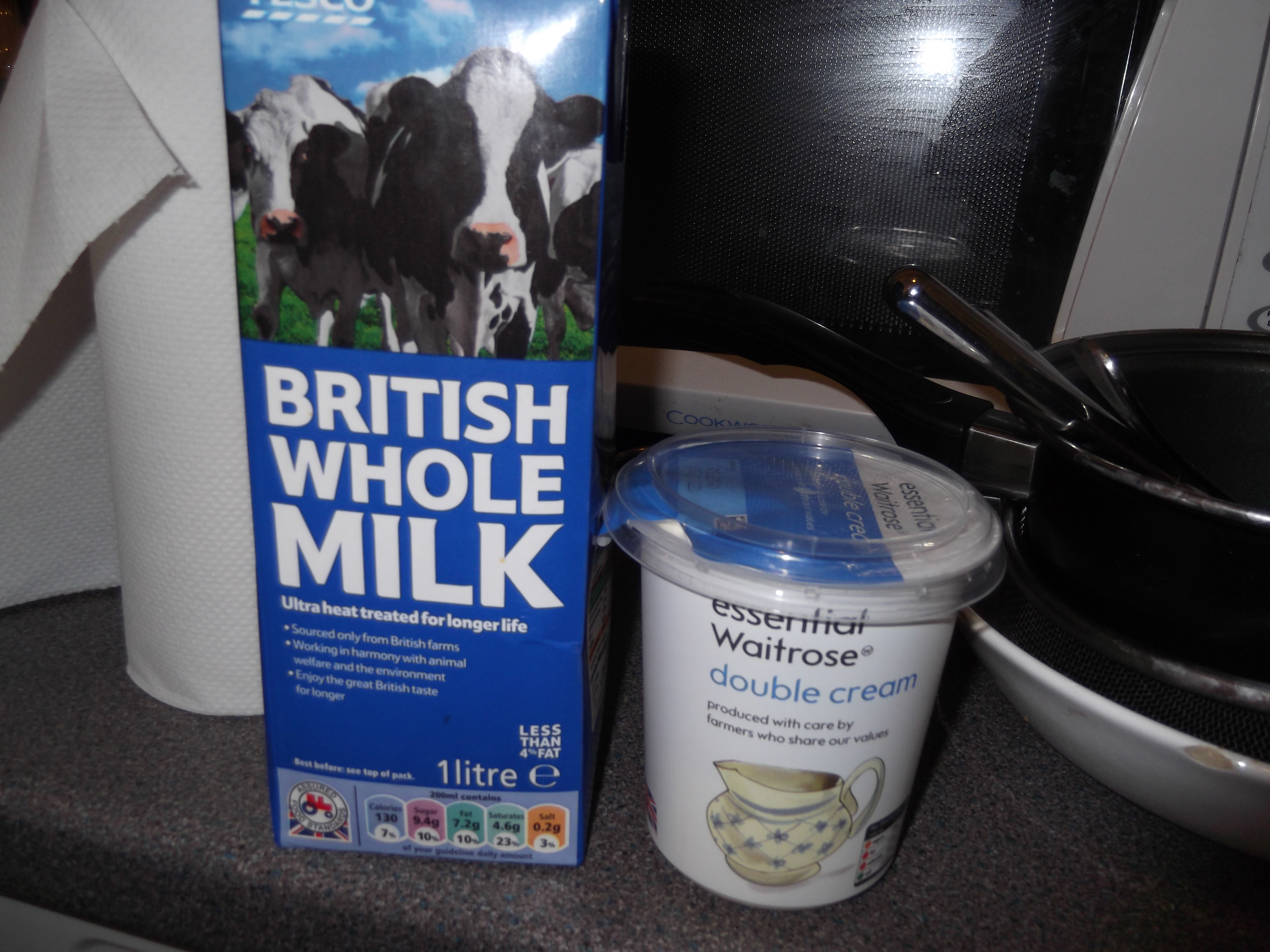 First, mix the milk and cream into a saucepan and heat on the lowest possible setting until it steams. While watching that like a hawk, whisk the egg yolk and sugar together. Add the milk and cream while whisking constantly and return that to the heat, stirring until it thickens and starts sticking to your spoon.