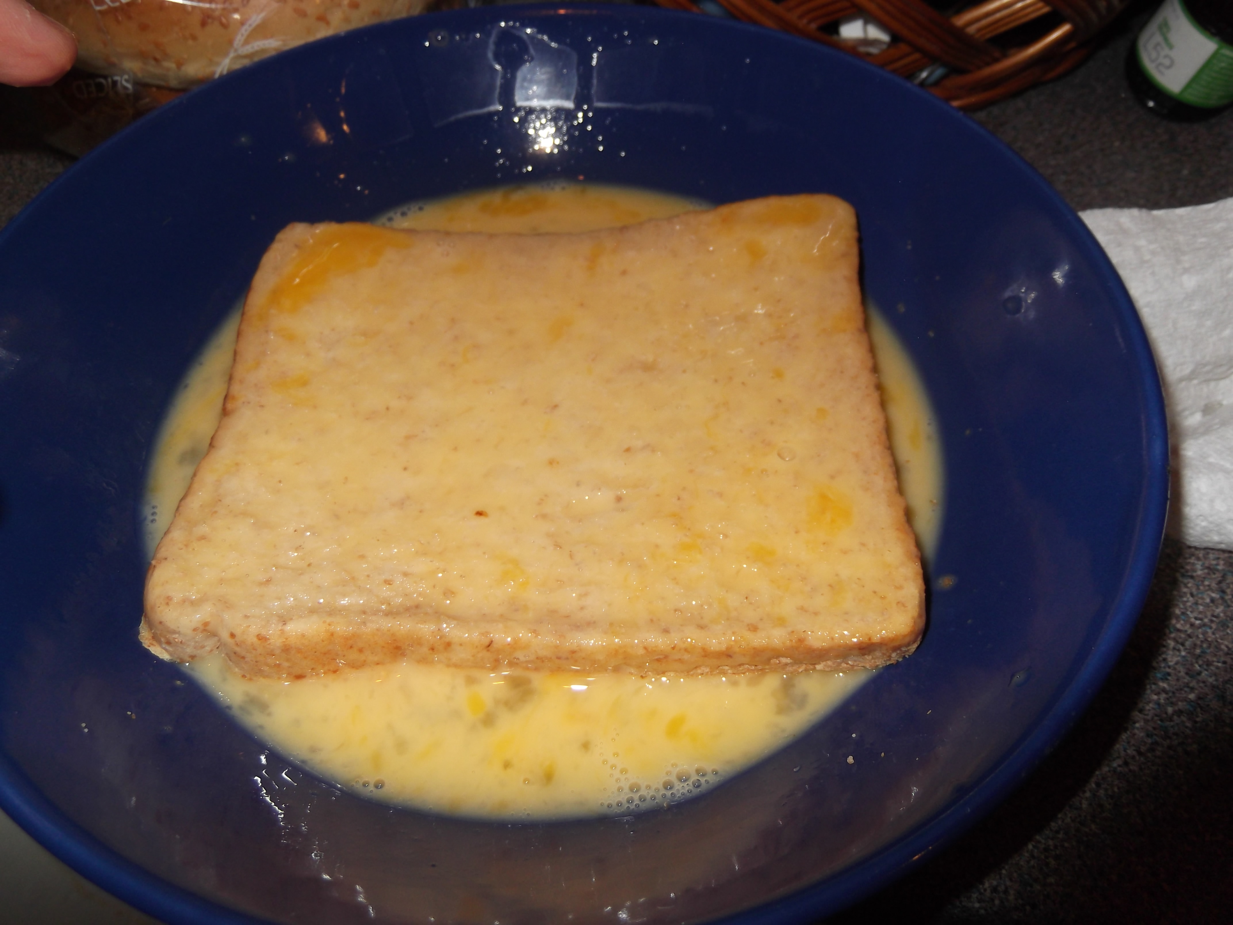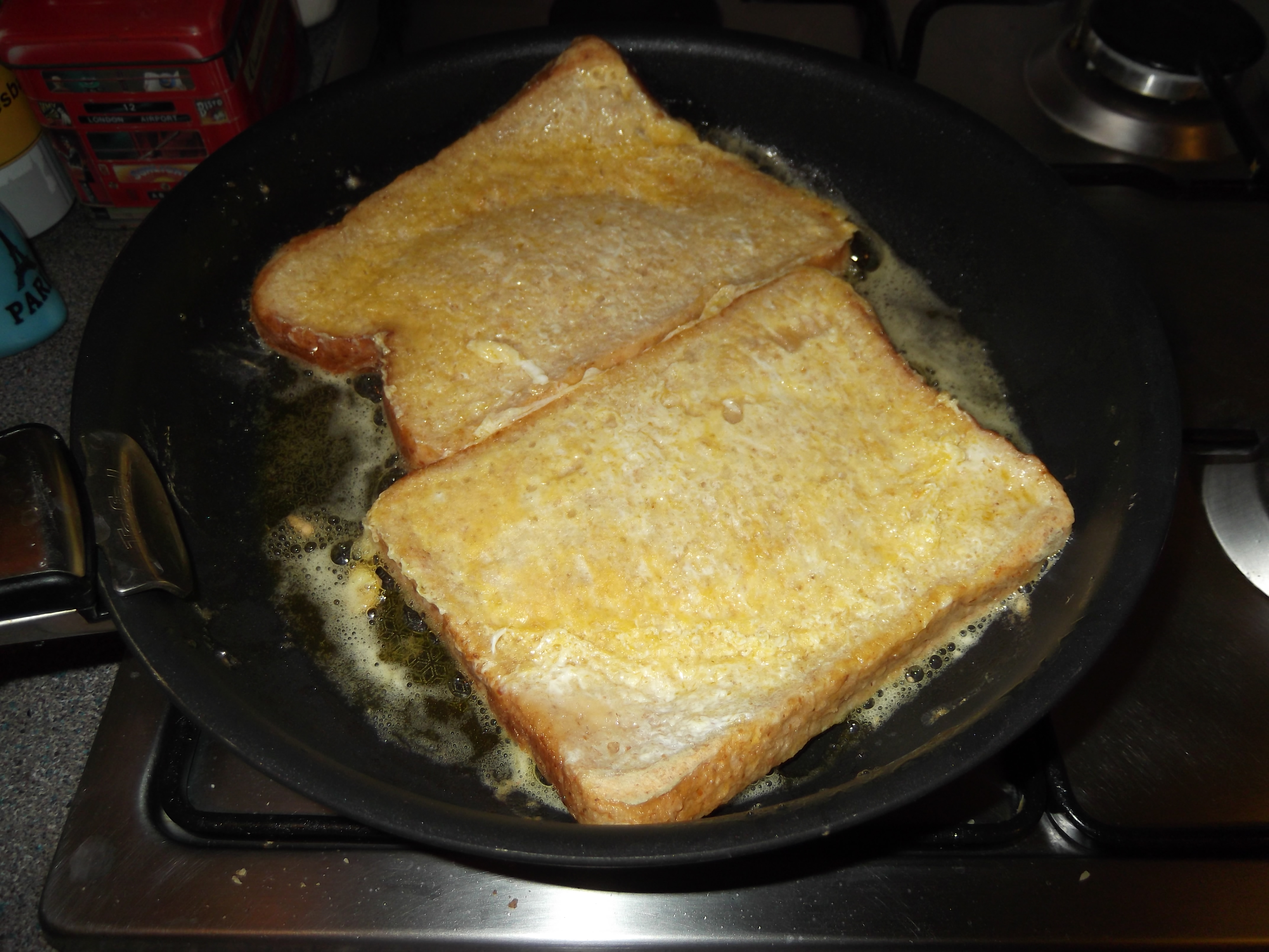Start gently heating your frying pan (it needs to be big enough to hold two slices at least). I use Flora or butter for French toast, never oil. Simultaneously dunk the first slice of toast into the egg. Make sure the mixture is really seeping in: the toast should be heavier and almost break off in your hand.