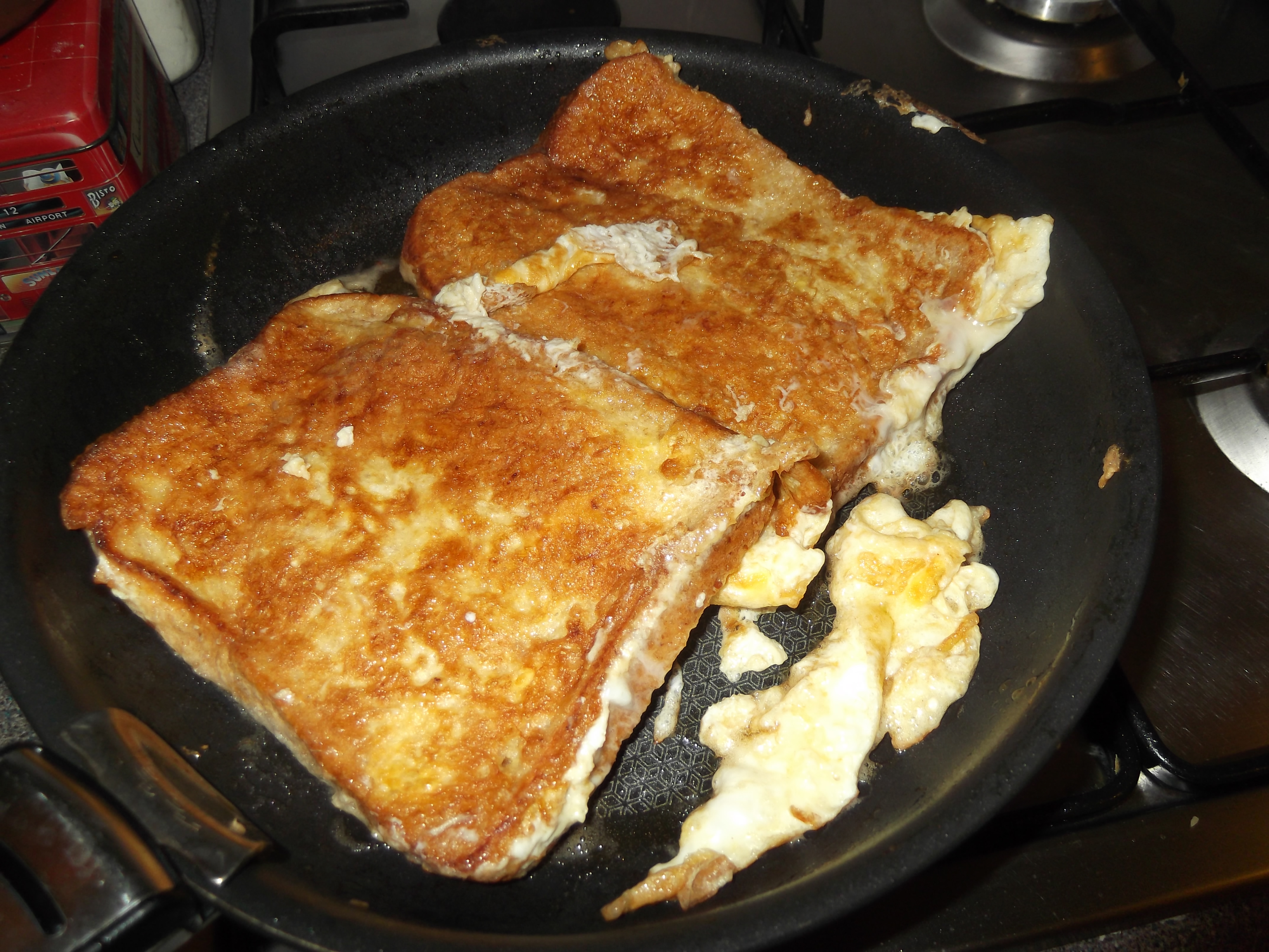 Gently drop the slice into the sizzling pan. Immediately prepare the next one while the first side of the first slice is done. By the time you’ll drop in the second slice, you’ll be able to flip the first slice. It may not be brown yet, but you allowed to like it more gooey, or to flip as long as you like.