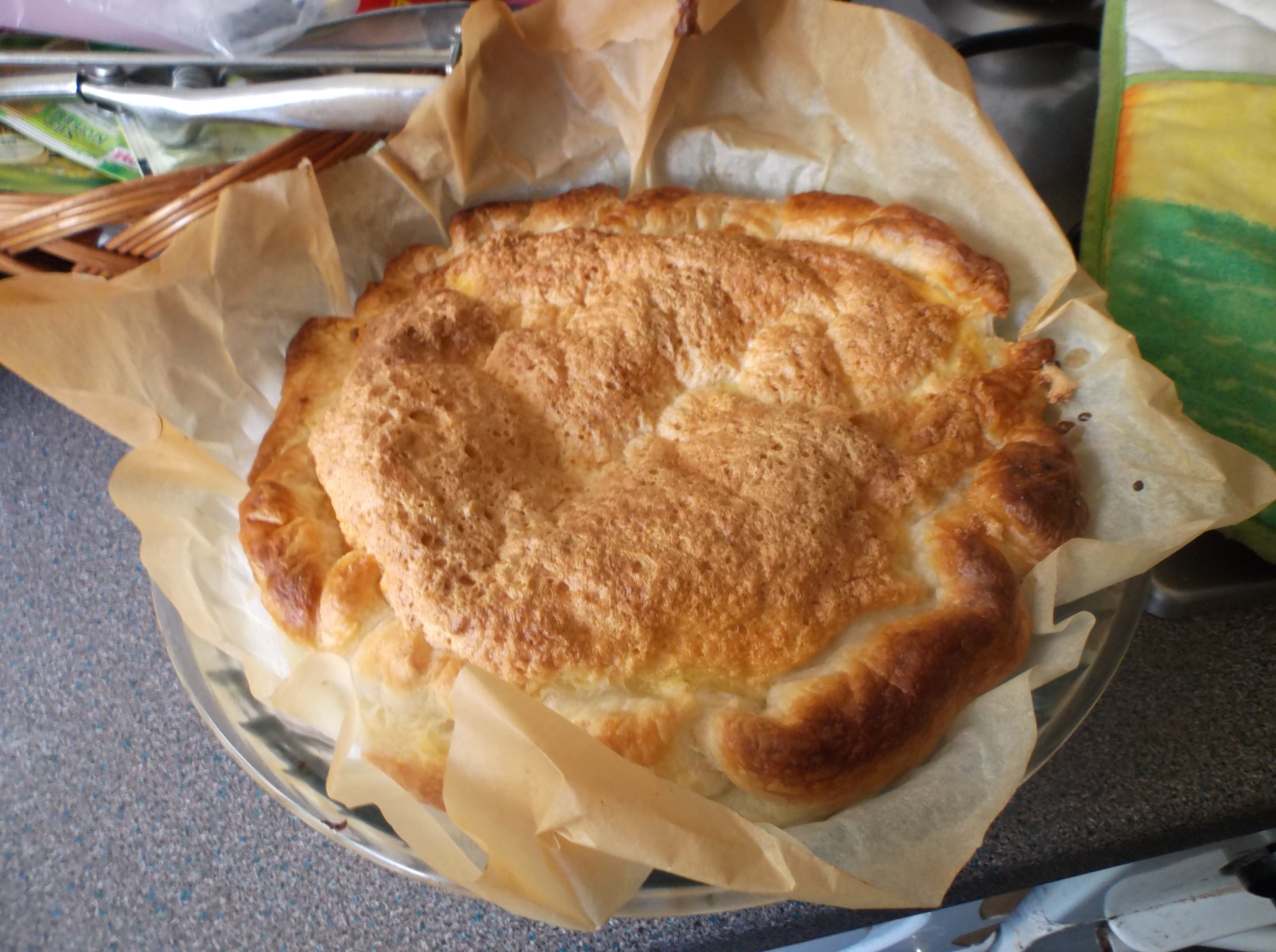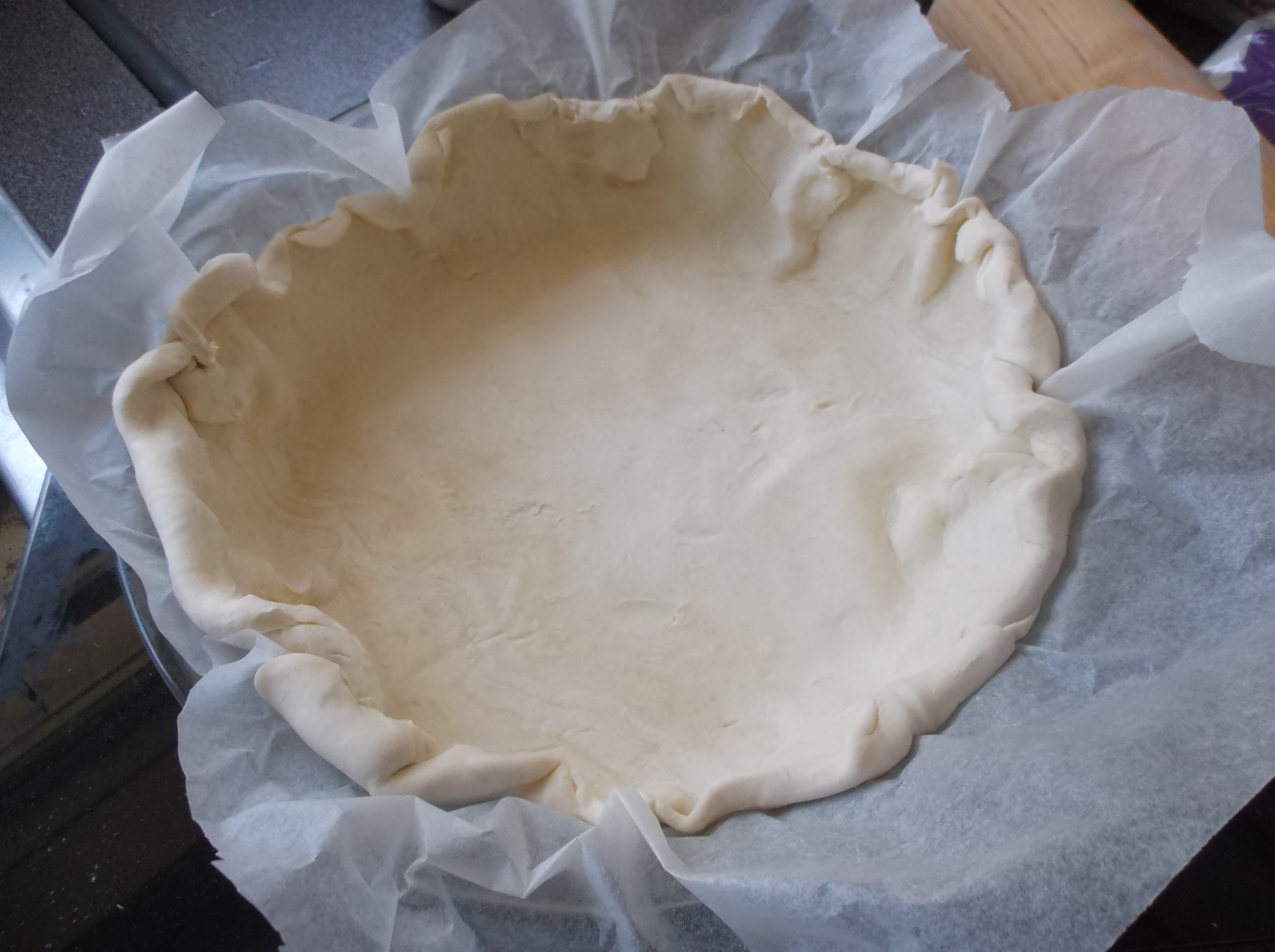 Roll out the pastry. They tend to be square-ish, so you might have to cut bits and pieces off the edges and add them somewhere else so the entire dish is covered when you put it in (don’t forget to butter it first, or use baking paper). I like making a bit of a roll at the top of the pastry dish so it doesn’t spill out while cooking.