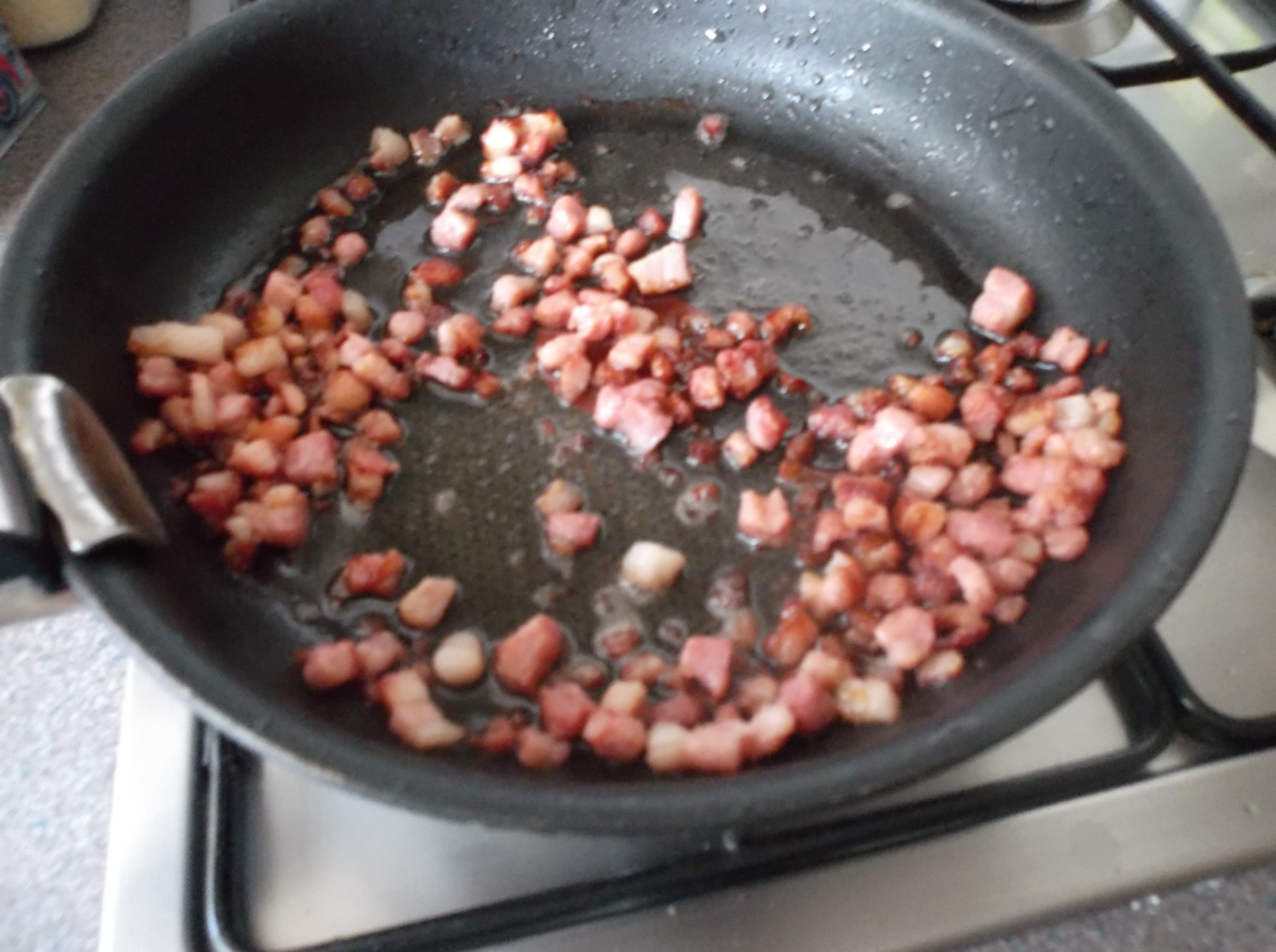 Put a little butter in a pan then fry the bacon or Pancetta. Make sure it doesn’t go brown, or your quiche will end up tasting quite roasty.