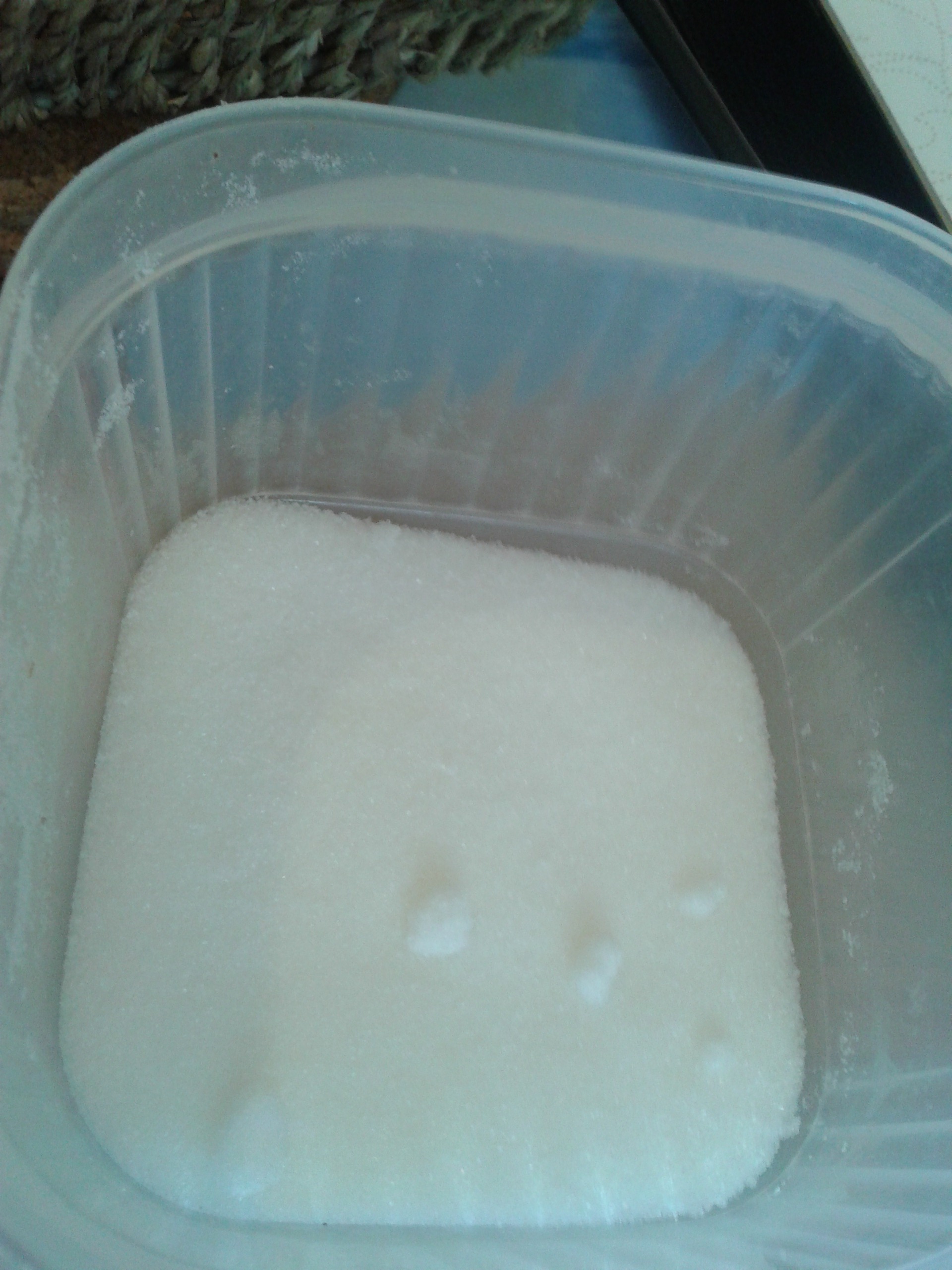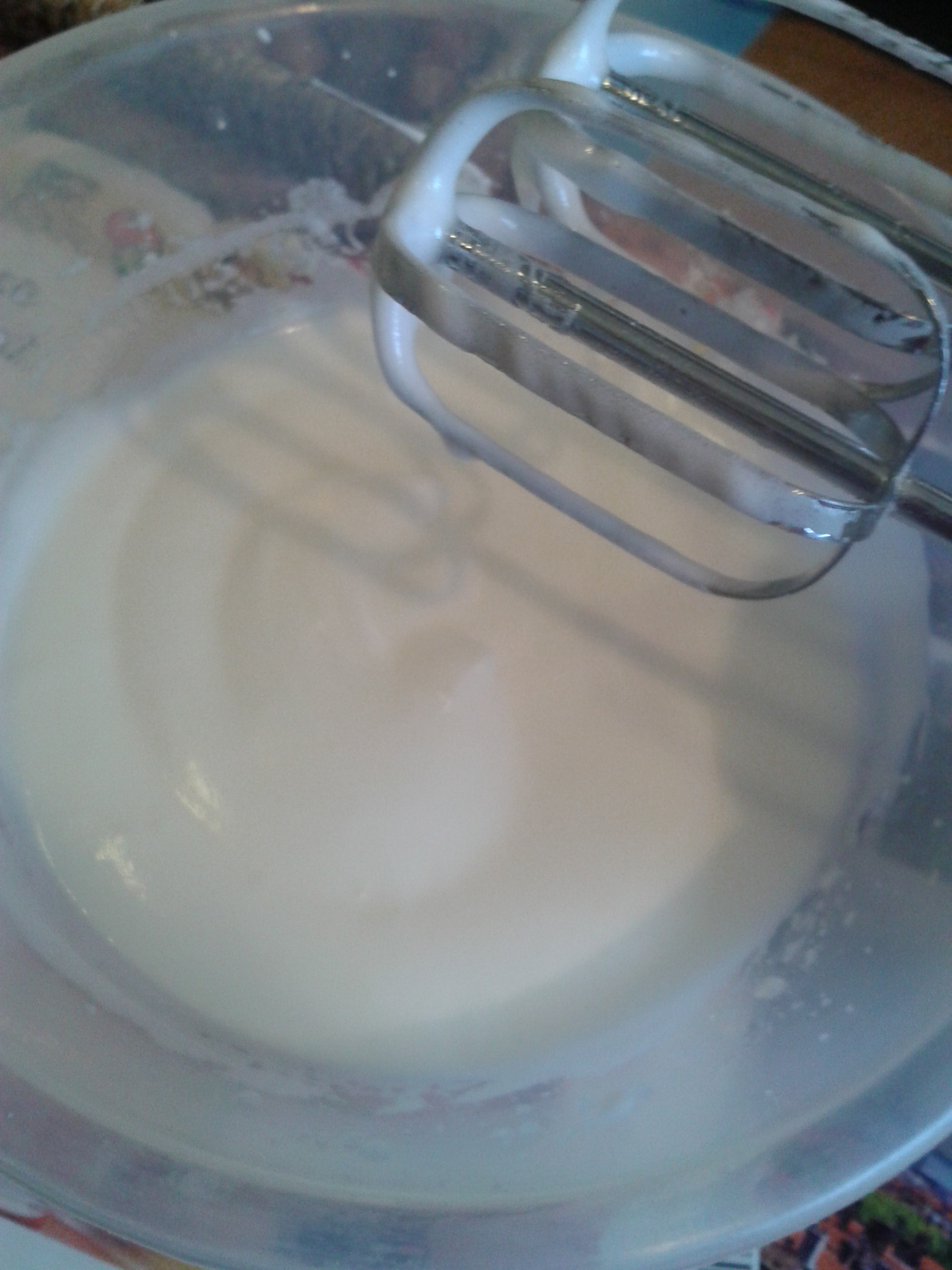 Add the sugar to the whites and start beating them until they’ve gone white and stiff.