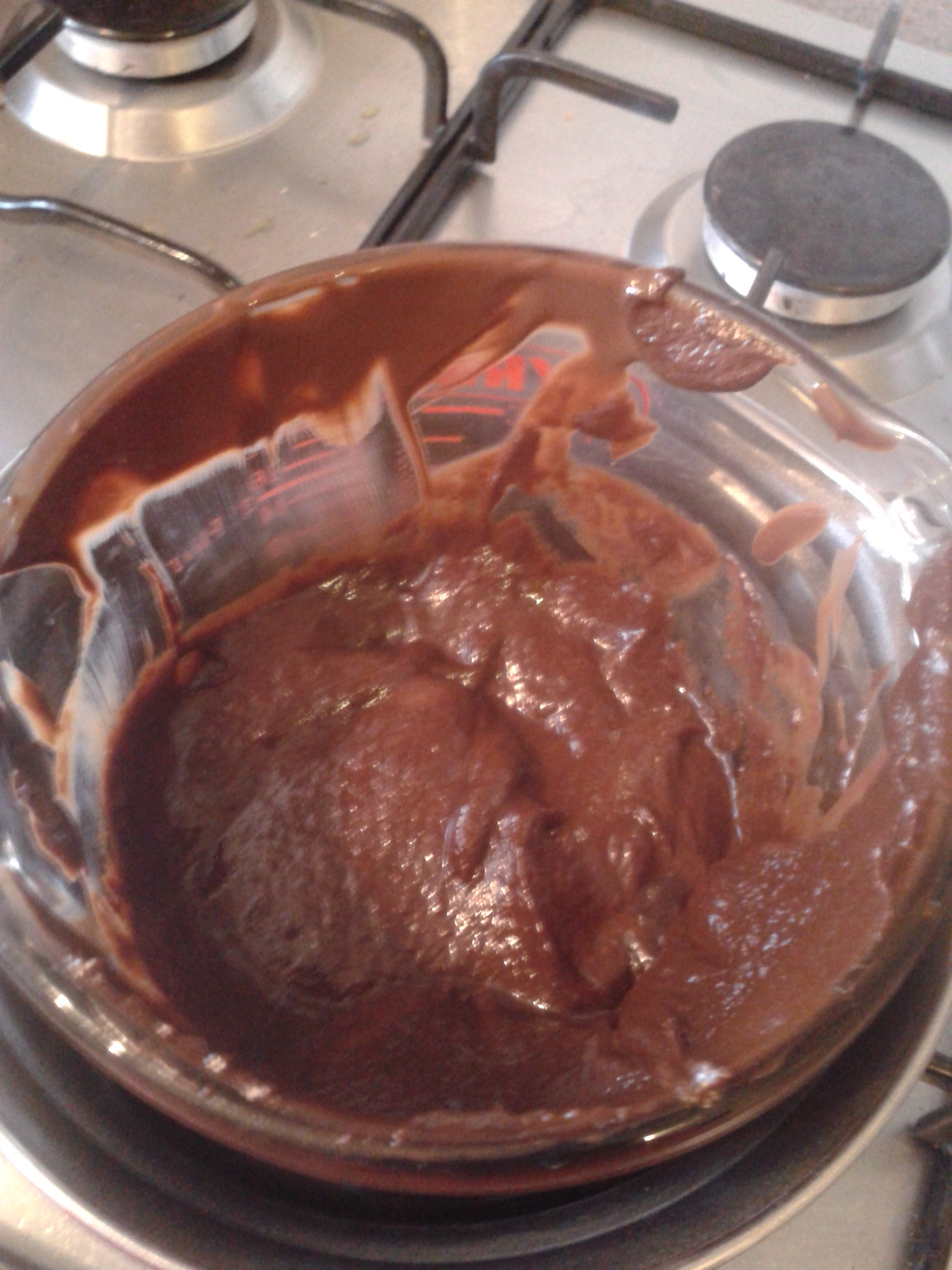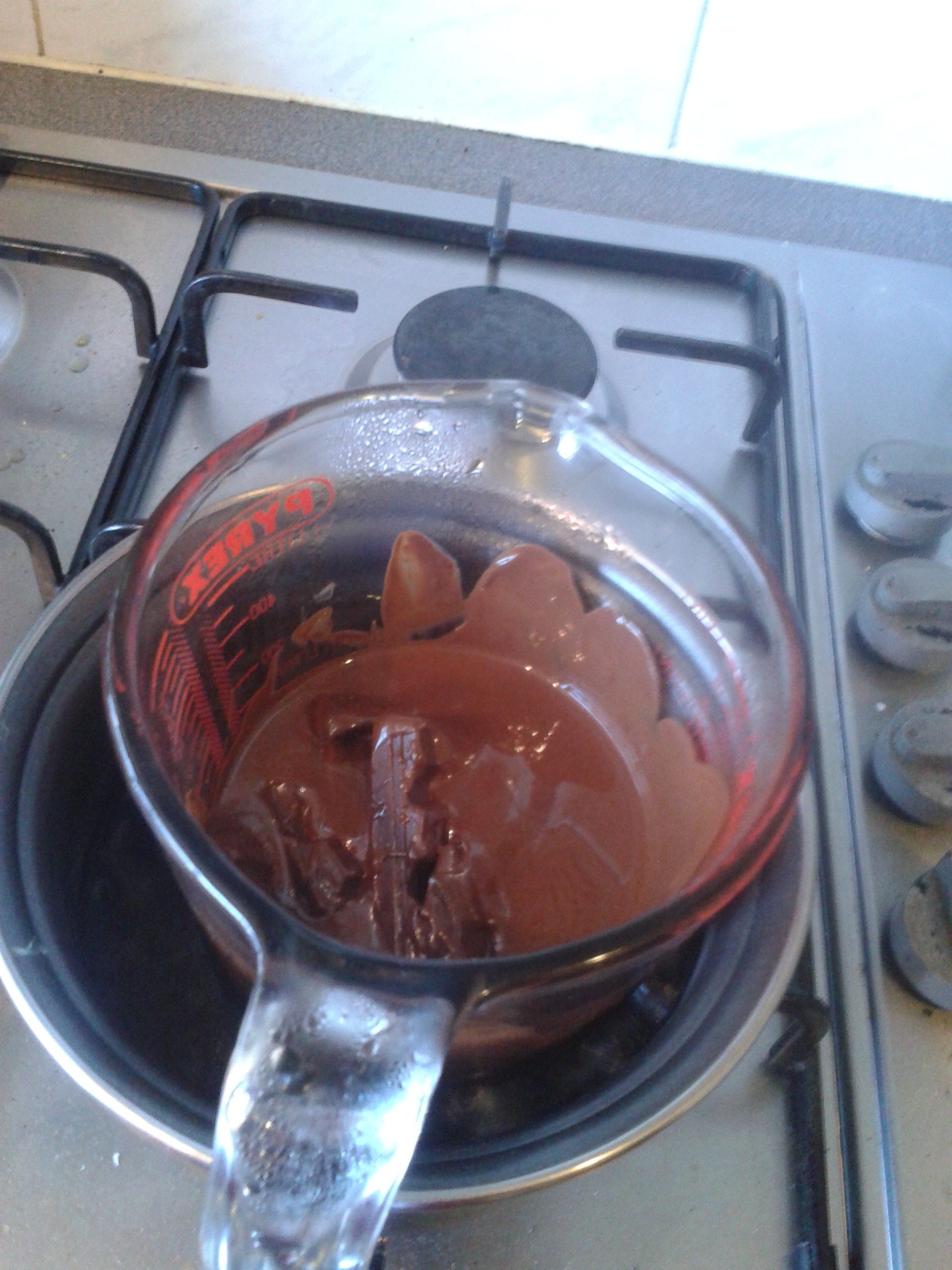 First, melt the chocolate. I use a Pyrex jug in a saucepan with boiling water. When that’s all nice and melty, get two mixing bowls. Put the chocolate in one and add the egg yolks. Egg whites go in the other bowl.