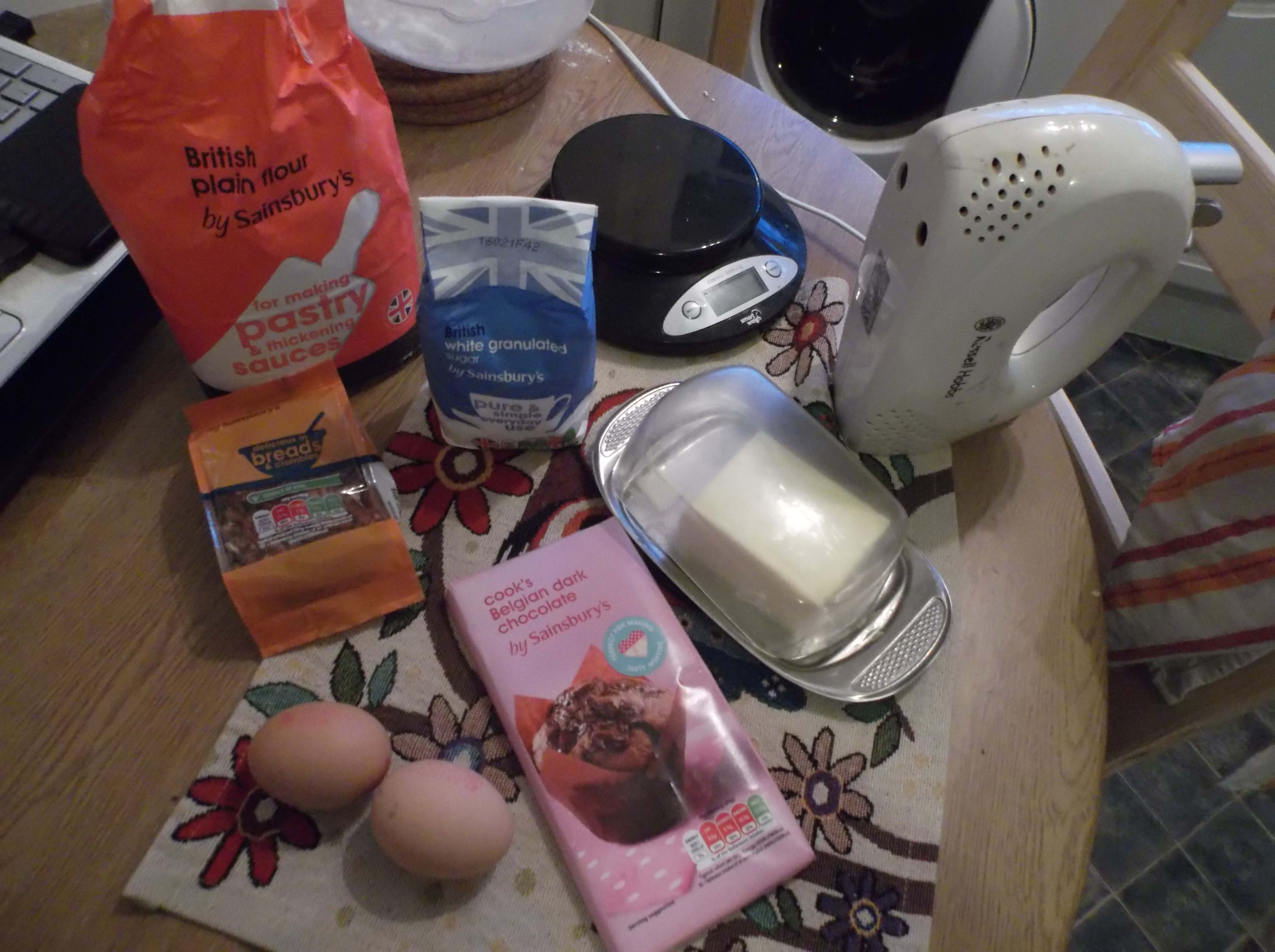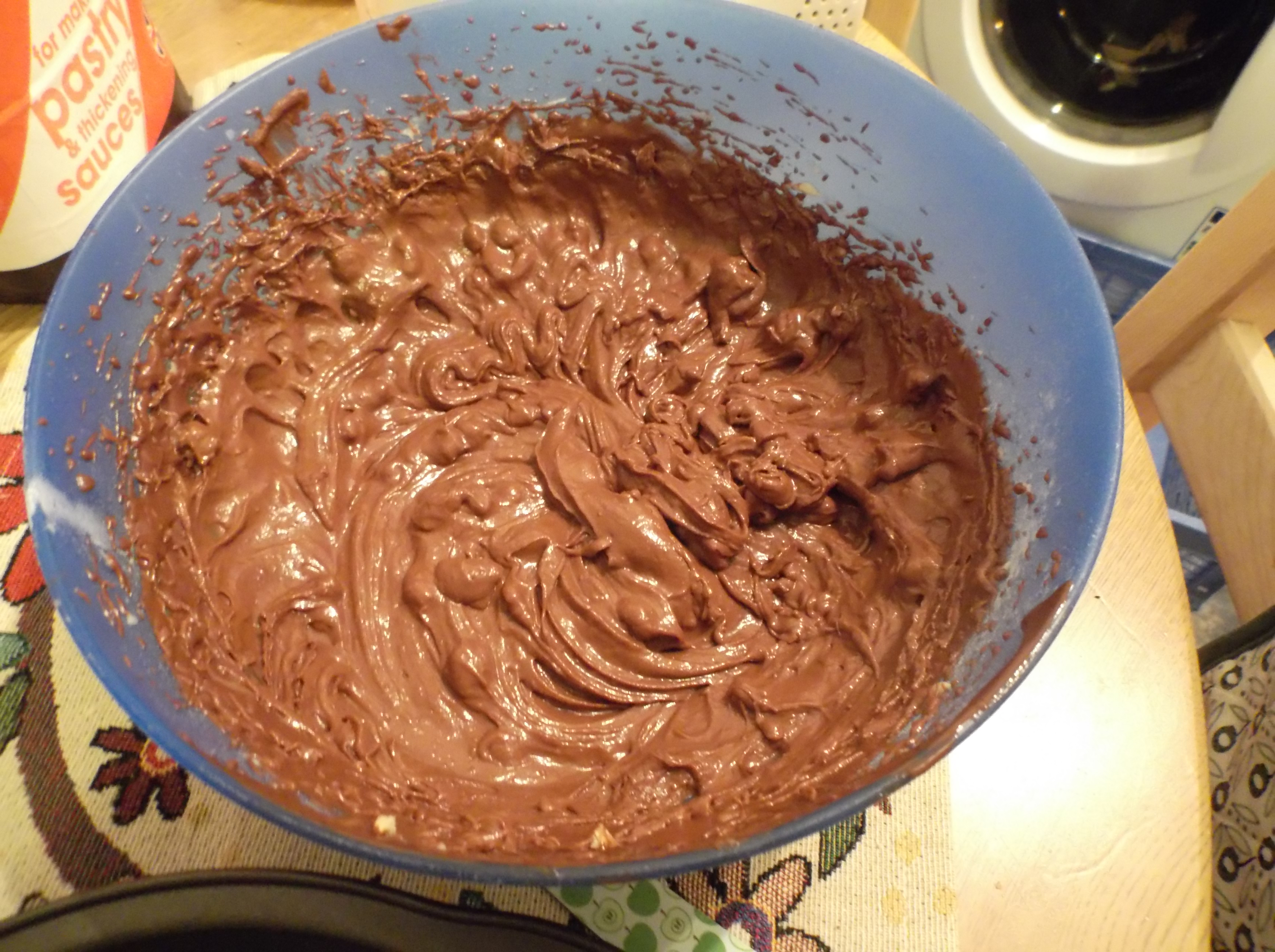 Pour the butter, sugar and eggs in a mixing bowl and start stirring. Slowly add the flour (watch out, it goes everywhere if you’re not careful) and finally add the chocolate. Mix well until it’s an even mixture.