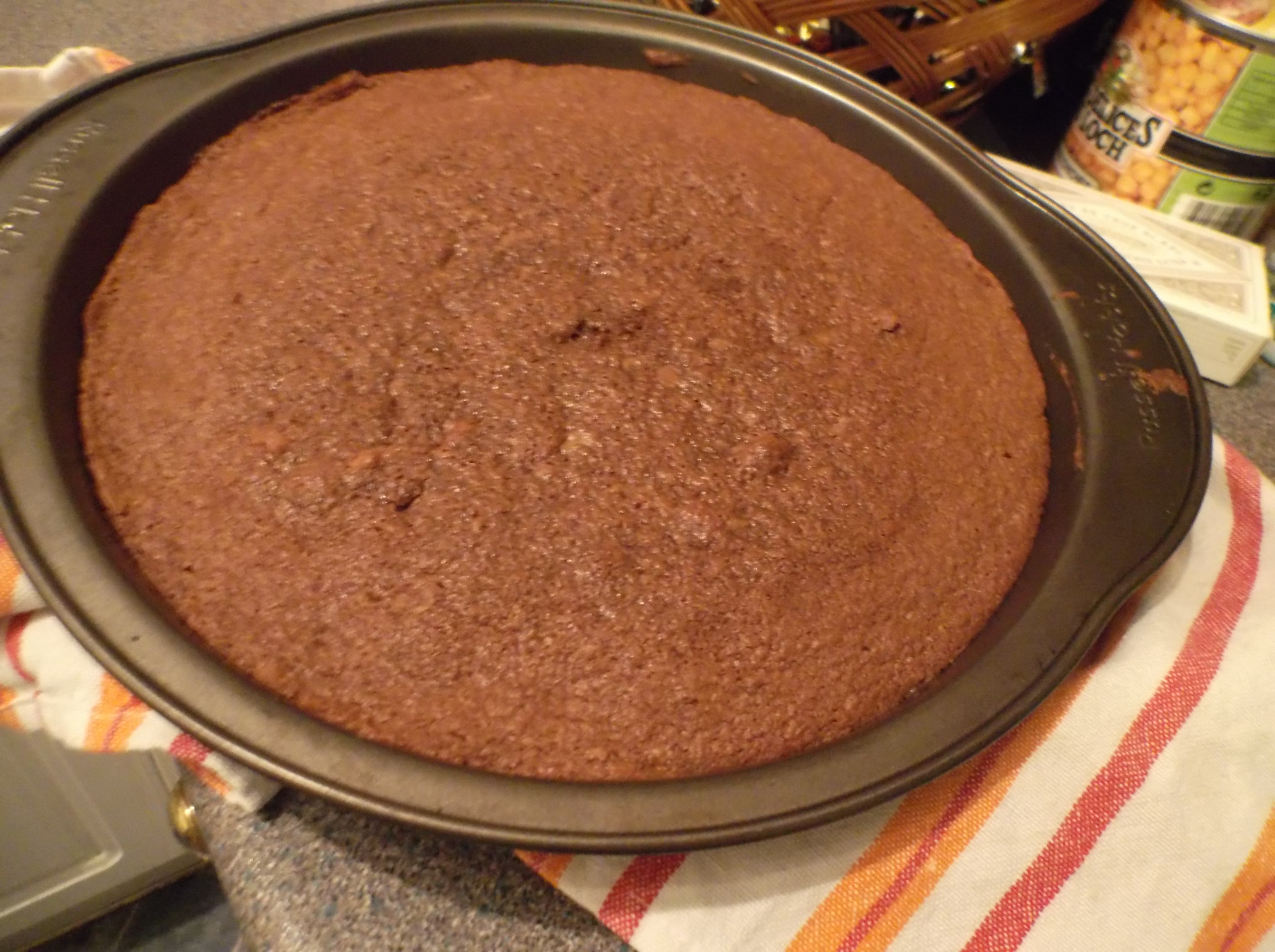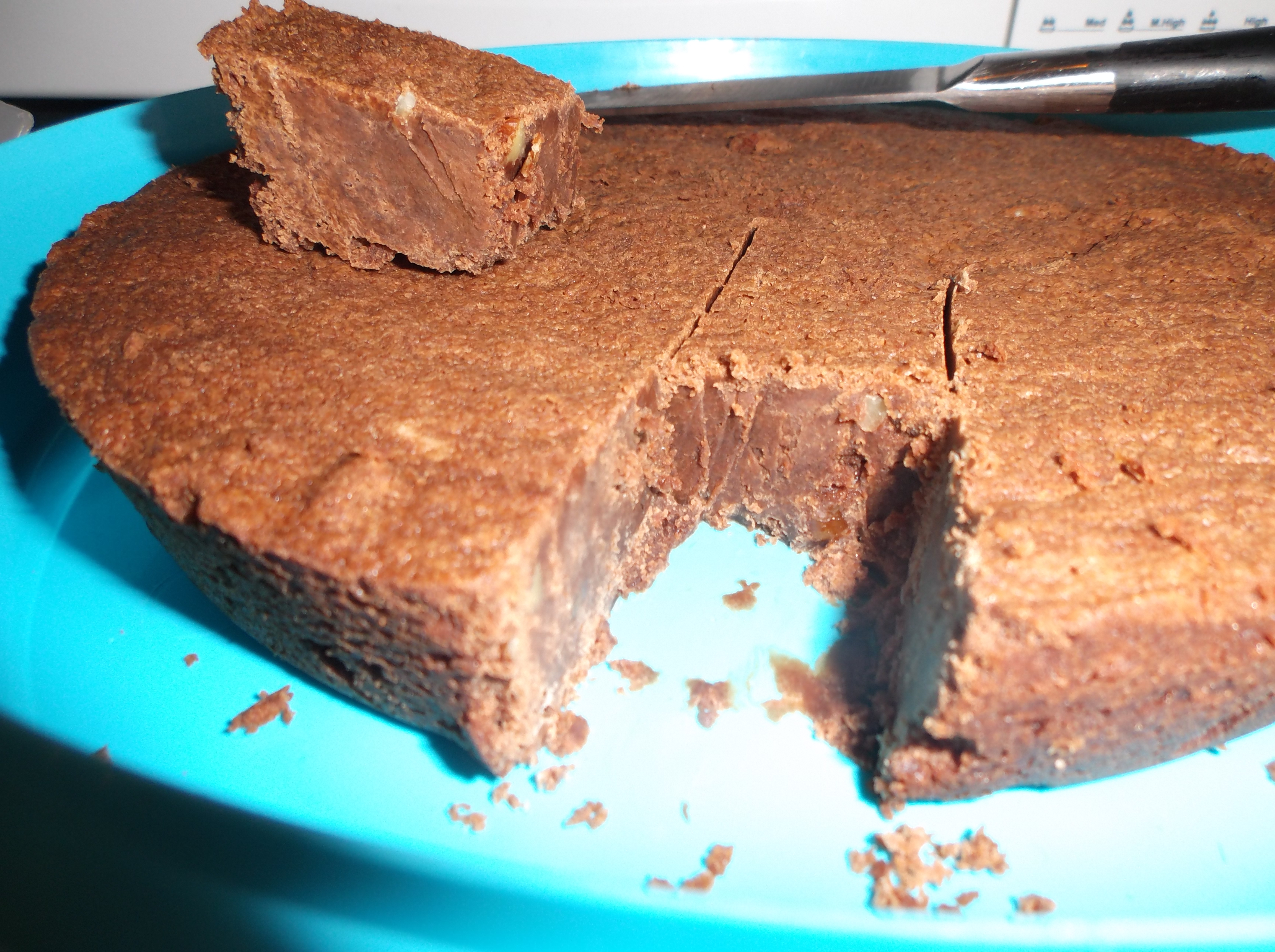 Pour the mixture in a brownie tin (round or square) with a high edge. Put it in the oven for 25 to 35min until set. Stick a knife in the centre and check. As opposed to a normal cake, you want there to be some mixture sticking to it.