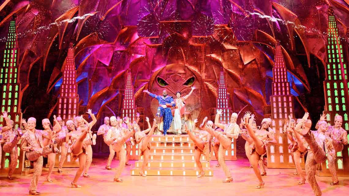 Dean John-Wilson (from Britain’s Got Talent) is Aladdin, and former Sugababe Jade Ewen plays Jasmine. The pair make a cute couple, and both work their American accents like there’s no tomorrow. Aladdin gets three friends who provide easy comic relief instead of Abu, and Jasmine similarly has three maids who instead of Rajah. Iago is also a person instead of a parrot, and the magic carpet barely makes an appearance and does not have a personality.