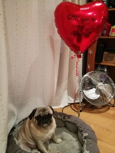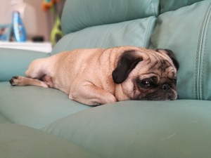 Pugs are infamous for having a plethora of health issues, but we had so far been fairly lucky with Krumpet. Like many of his kind, he has pigmentary keratitis, where his lashes scrape the cornea and slowly damage it until they eventually go blind. Many people chose to have the eyes operated on, but that is best done when the dog is very young and can recuperate well. Krumpet has eyedrops twice a day and while he will more than likely go blind in his old age, he has so far only lost some vision. He is very lucky to have very wide nostrils, and so he has not had to have anything done to improve his breathing. British pugs are known to be too inbred, especially if you buy them from someone who doesn’t know what they’re doing. US pugs, like Krumpet, are slightly better off. Thankfully, things are changing in the right direction, and reputable breeders are trying to fix their snouts and nostrils by breeding them with different types of pugs.