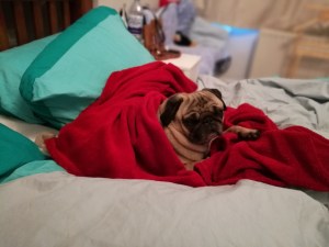 While I slowly moved in, Krumpet and I had to come to an understanding about the bed. I’m a restless sleeper and that double wasn’t going to be big enough for the three of us. So the dog slowly had to learn to sleep in his own space, be it his favourite couch, or his bed which I ended up turning into a tent filled with pillows and blankets. I learnt how to walk him without struggling (trust me, when a pug doesn’t want to go somewhere, it’ll let you know), and how to pick up poo without feeling grossed out. He vomited after dinner, and once I got back to find diarrhoea all over the kitchen floor. I taught him the command “towel” so he’d wipe his paws after a muddy walk, and while his Dad was away giving conferences in exotic locations, Krump and I enjoyed watching all my favourite shows on the big TV while he gently snored by my side.